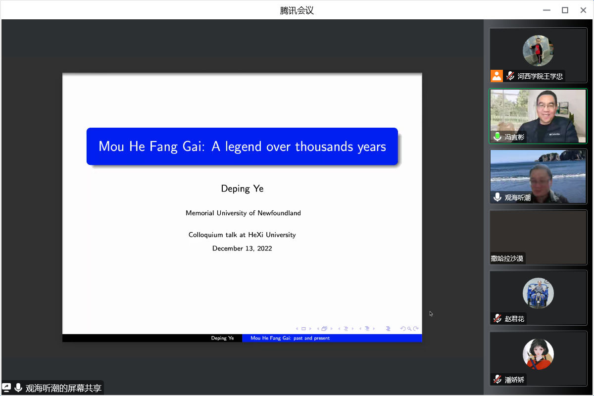 12月13日晚8:00,数学与统计公司邀请加拿大纽芬兰纪念大学叶德平教授为师生开展《牟合方盖:跨越千年的历史传奇》的线上学术报告。数学与统计公司师生近160人聆听了此次报告。